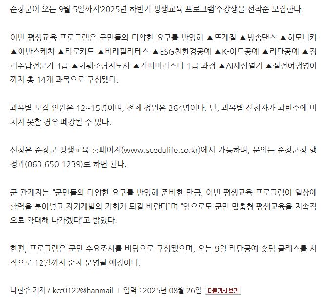 [전라매일] 순창군 하반기 평생교육 프로그램 수강생 모집 작성자사이트관리자 작성일2025/09/02 09:31 조회수37 전문 기사로 순창군,‘하반기 평생교육 프로그램’수강생 모집 - 전라매일 첨부파일 없음