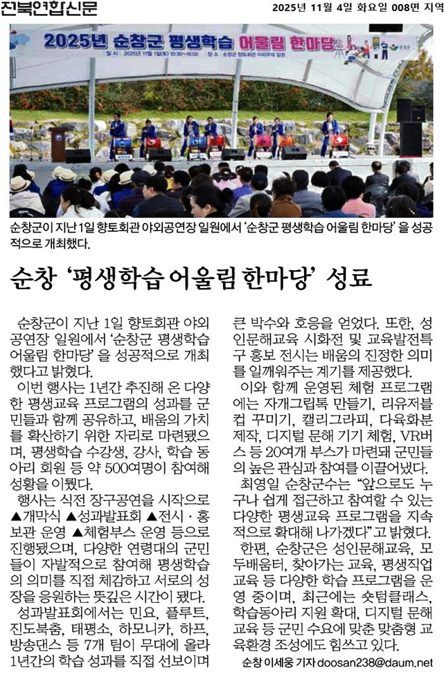 [전북연합신문] 순창군, 평생학습 어울림 한마당 성료 작성자사이트관리자 작성일2025/11/03 15:22 조회수10 전문 기사로 http://www.jbyonhap.com/news/articleView.html?idxno=454333 첨부파일 없음